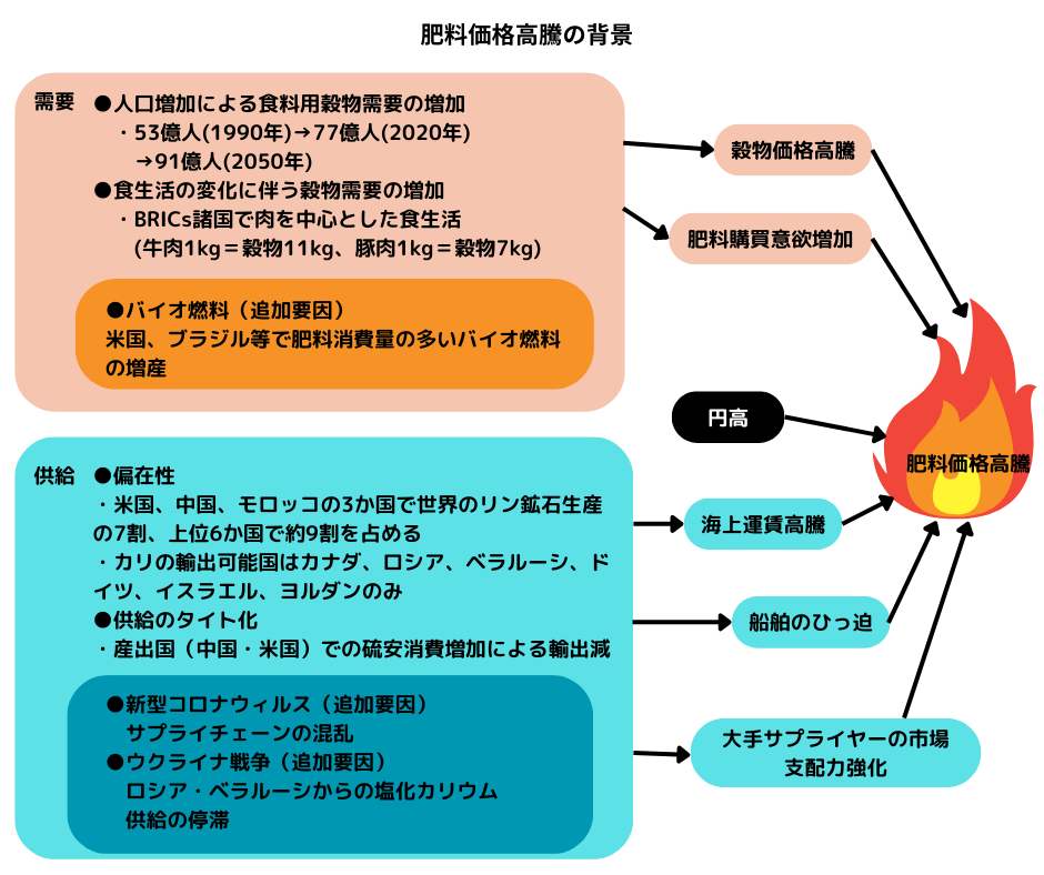 近年の「追加要因」としては、コロナ・パンデミックによって、世界的なサプライチェーンが混乱し、肥料原料の輸送も滞ったことが挙げられます。そして、ウクライナ戦争によって、ロシア・ベラルーシからのカリウムの供給が滞ったことも「追加要因」であり、まさに「泣きっ面に蜂」状態であったと言えます。