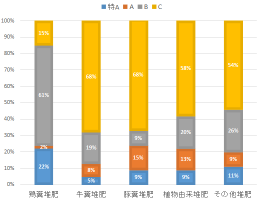他方、鶏糞堆肥はCはわずか15%で、特Aは22%、Aは2%、Cが61%となっています。鶏糞堆肥の場合は、養鶏場に乾燥機能を備えた堆肥化装置を設置されているところが多く、含水率が35%以下になっているところが多いので、C評価が少ないのではないかと考えられます。