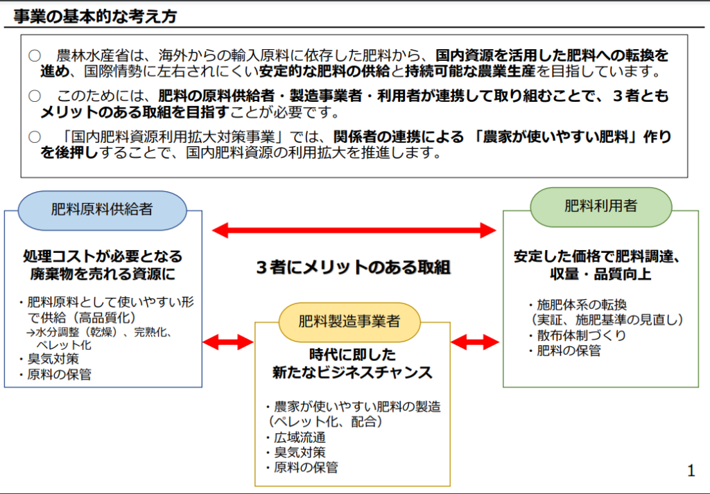 農林水産省も、2023年1月には「国内肥料資源利用拡大対策事業」を打ち出しました。その基本的な考え方は次の3点です。