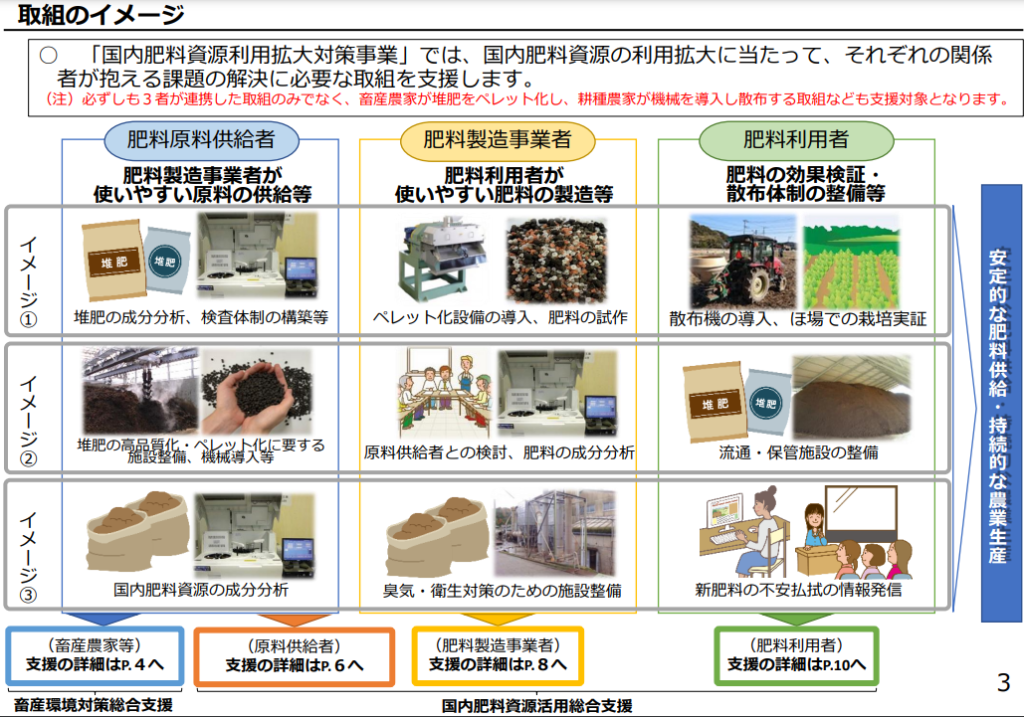 3.関係者の連携による 「農家が使いやすい肥料」作りを後押しすることで、国内肥料資源の利用拡大を推進する。