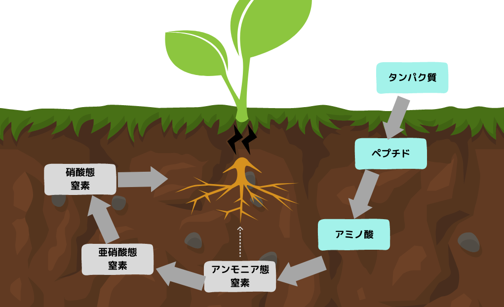 農作物にとって必要不可欠な「無機態窒素」を、農作物が吸収できるようにするには、有機肥料に含まれる窒素源が硝酸態窒素(NO3–)に分解される必要があります。つまり、その分解が効率良く行われていれば、良い土であるといえます。土に混ぜられた肥料(有機態窒素)は、微生物によって①アンモニア態窒素(NH4+)→②亜硝酸態窒素(NO2–)→③硝酸態窒素(NO3–)と分解されます。①→②の過程を「アンモニア酸化」、②→③の過程を「亜硝酸酸化」といい、これらの過程を総称して「窒素循環」といいます(図2)。