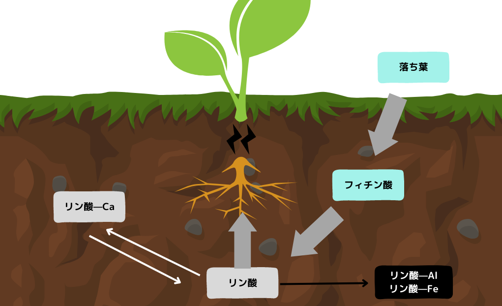 リン循環によって生成されたリン酸は、土壌中のミネラル量や土壌pHにも影響されます。土壌中のミネラルである、カルシウム(Ca)、アルミニウム(Al)、鉄(Fe)などが過剰であるとリン酸がそれらと化学結合してしまい、植物に吸収されるリン酸が少なくなってしまいます。また、pHが7以上のアルカリ性域だとカルシウムと結合しやすく、酸性域だとアルミニウムや鉄と結合しやすくなります。pHが6.5付近だとミネラルとの結合がしにくくなります。