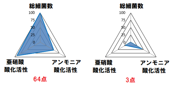 SOFIXでは、この窒素循環活性を図3で示すような三角形のレーダーチャートにしてわかりやすく表現します。三角形の頂点がeDNA法で測定した総細菌数です。そして三角形の右下が、アンモニア酸化活性評価値、左下が亜硝酸酸化活性評価値です。これにより、三角形の面積が大きいほど、窒素循環が活発で、良い土であることを示しています。三角形の面積が小さいと、細菌数も少なく、肥料の分解が進んでいないことも明らかになります。