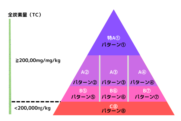 MQIでは、鶏糞堆肥、鶏糞以外の動物性堆肥、植物性堆肥、その他堆肥(食品残渣、ぼかし肥料等)など各種堆肥の特徴に合わせて4つのカテゴリーに分けて、評価基準を設け(表3)、パターン判定と特A①~C⑧の評価を行っています(図6)。