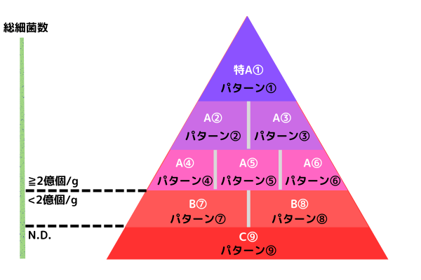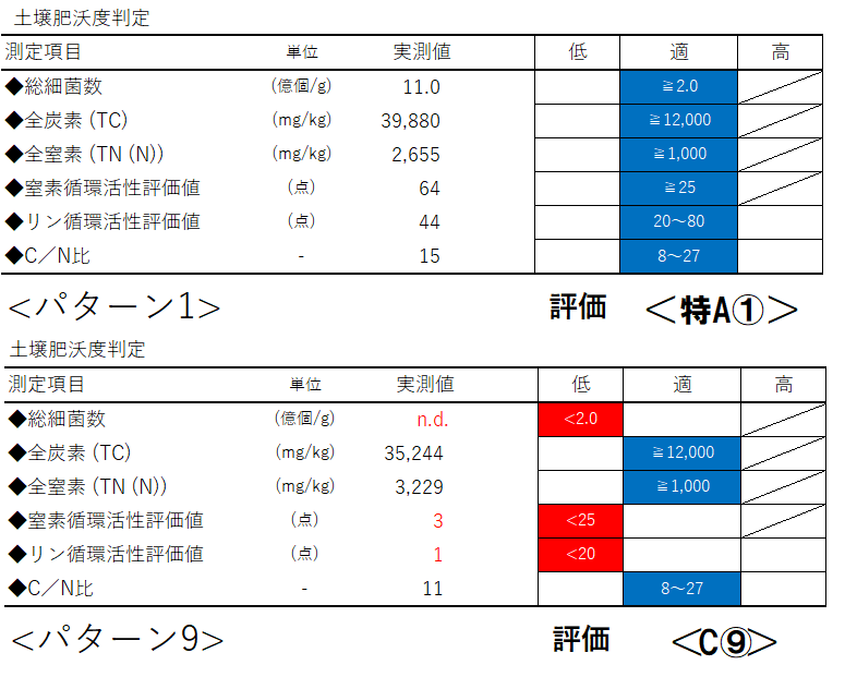 6項目の基準すべてを満たす場合は特A①と評価されます。総細菌数が2億個/g以上の場合は、それぞれの指標の達成状況に応じて、特A①、A②、A③、A④,A⑤、A⑥と評価付けされます。他方、総細菌数が2億個/g未満の土壌をB⑦、B⑧、さらに検出限界以下の土壌をC⑨と評価付けされます。表2の上は、特A①:パターン1の事例、下はC⑨:パターン9の事例です。