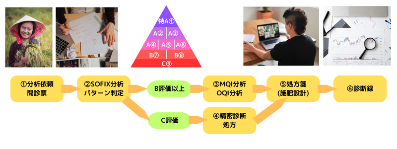 SOFIX技術では、土壌や堆肥、有機資材の分析や評価を行うだけでなく、土壌の肥沃度を高めていくための施肥設計、土づくりの処方箋を出すことができます。